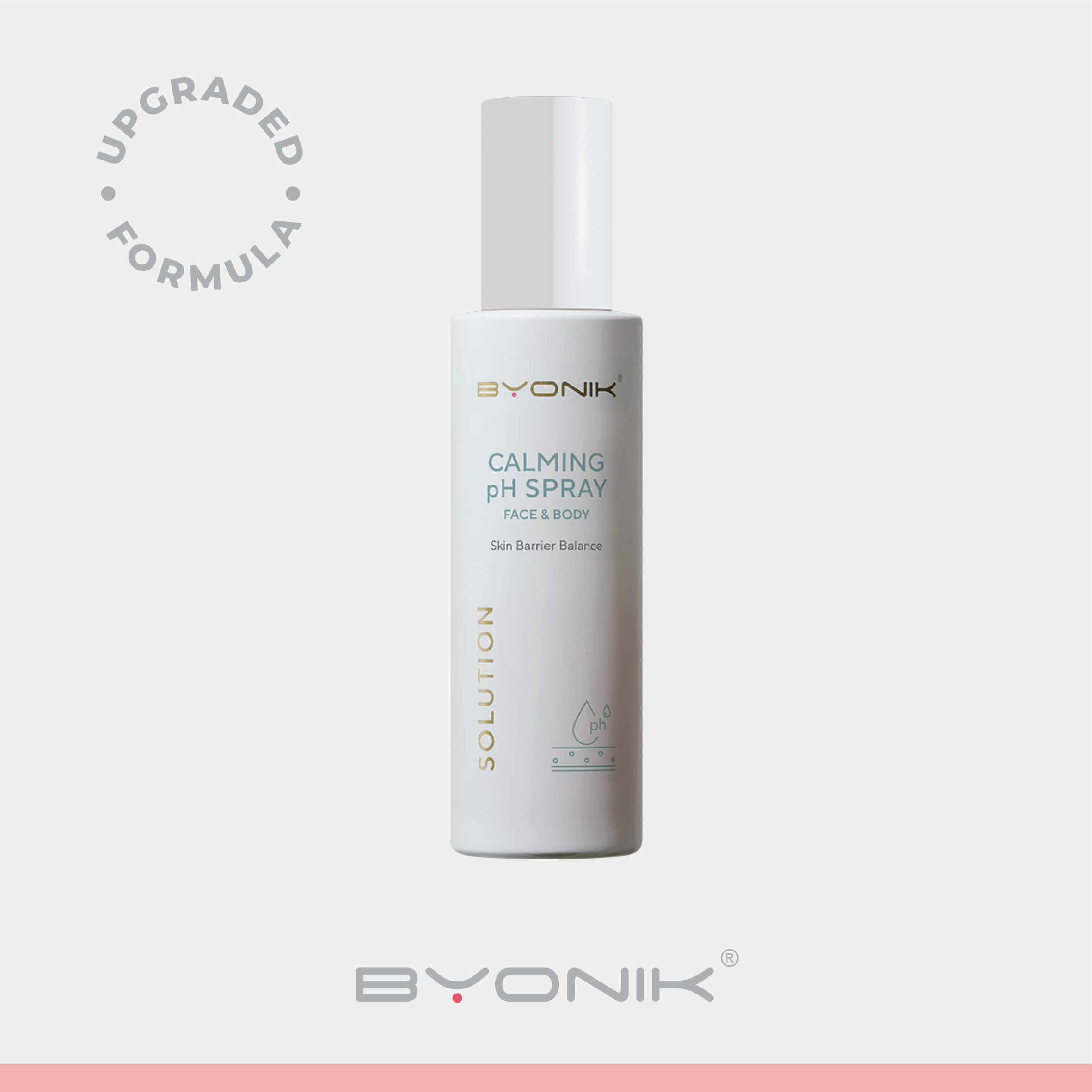 BYONIK® SOLUTION Calming pH Spray Face & Body is a versatile daily spray that provides soothing protection for irritated and stressed skin. With exceptional pH control, this spray acidifies the skin surface, buffers the pH of the hydrolipid film, and stabilises the acid protective coat. It helps to give the skin more resistance, counteract an imbalance of the germ flora, and prevent the transition of the skin to an inflammatory stage.